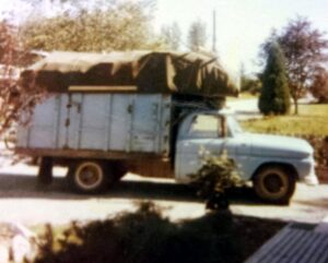 The next day Dad and Grandpa went to Maple Ridge and found us a house to rent. Within a week they had secured an office space to set up shop. I started grade 10 at Maple Ridge Senior Secondary that fall and we ended up moving again after only a month in the rental house. They were building a new mall (Maple Ridge Square) and the house was being sold to make way. The Realtor helped us out though, and set us up in Pitt Meadows in a duplicate rental. There we stayed until the house in Ruskin was built in 1975. Every weekend Dad would drive Old George out to the “stump farm” to clear the land. One Saturday not long after we got back, he had an accident. The brakes finally gave out on George and he crashed though a sign in a parking lot. Luckily, no one was hurt. So that’s when GMC George became Chevy George. George ended up with a Chevy hood, grill, fenders etc.