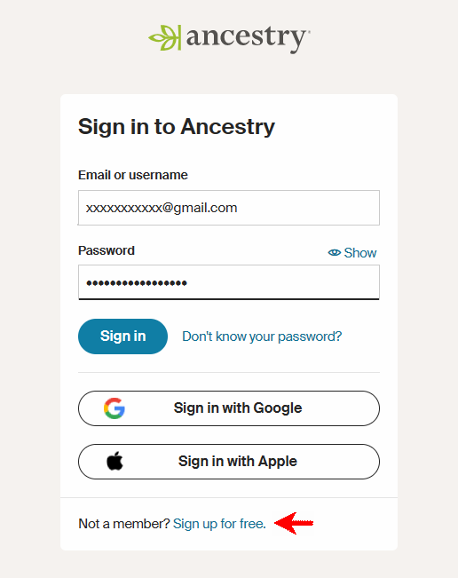You will see a sign in box like the one below upon entry to the Ancestry.ca website. You will need to sign in with either your Google account or Apple account, or you can sign up with Ancestry.ca for the free guest account there if you don’t already have one. This should allow you viewing access to at least the ancestors. If you would like to view living relatives, you will need to contact Judy for an Ancestry access invitation.